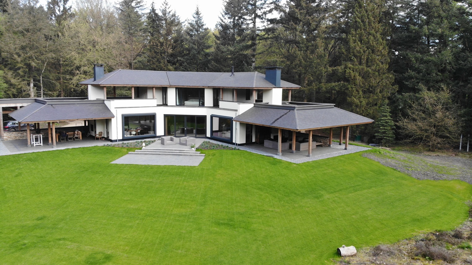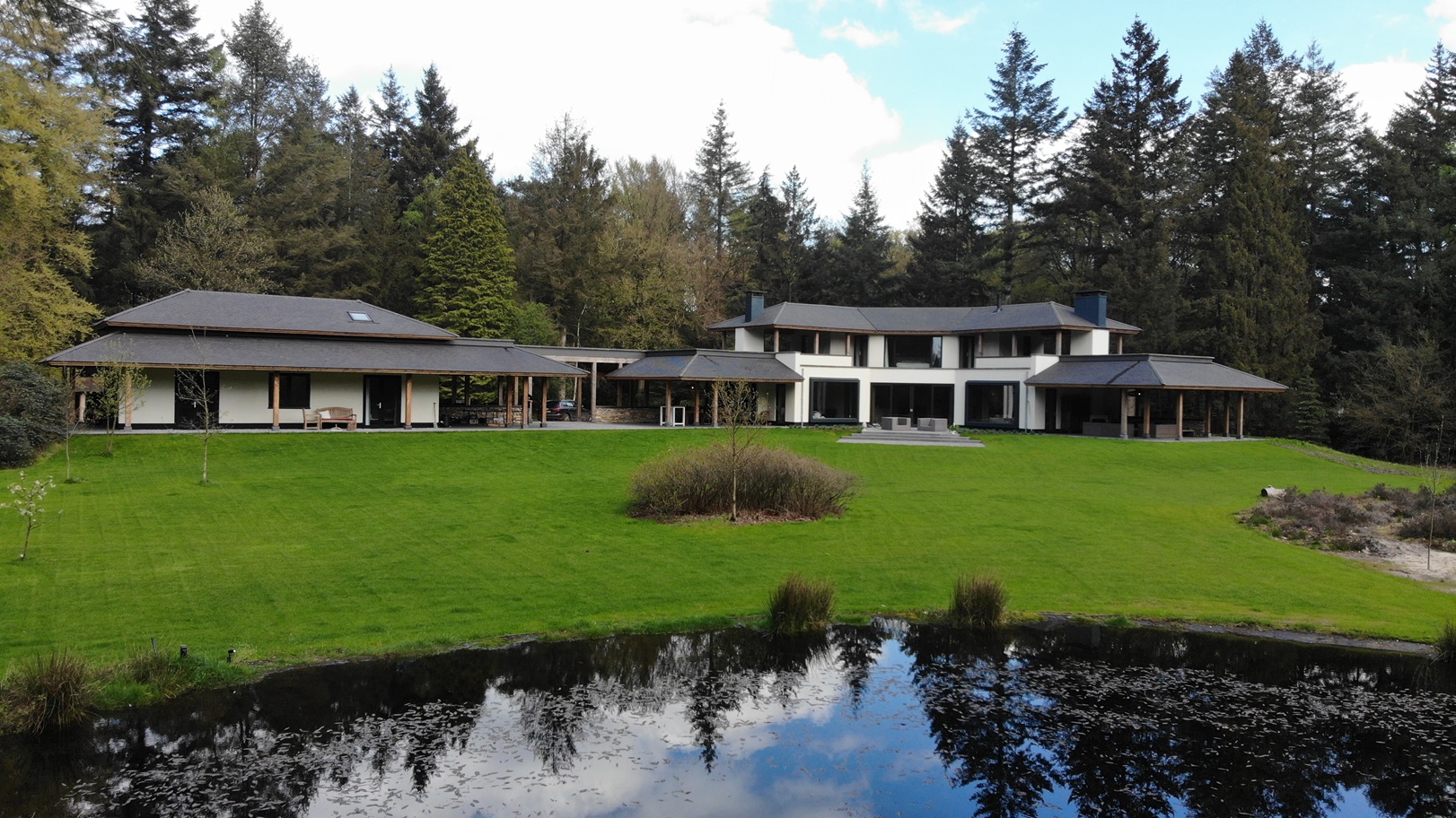 In deze prachtige omgeving is aan ruimte geen gebrek. Het inschatten van de juiste afmetingen is door de architect in dit geval perfect gedaan. De juiste oriëntatie op de bestaande vijver maakt het des te fraaier. Links een fraaie afbeelding van het bijgebouw in aanbouw.